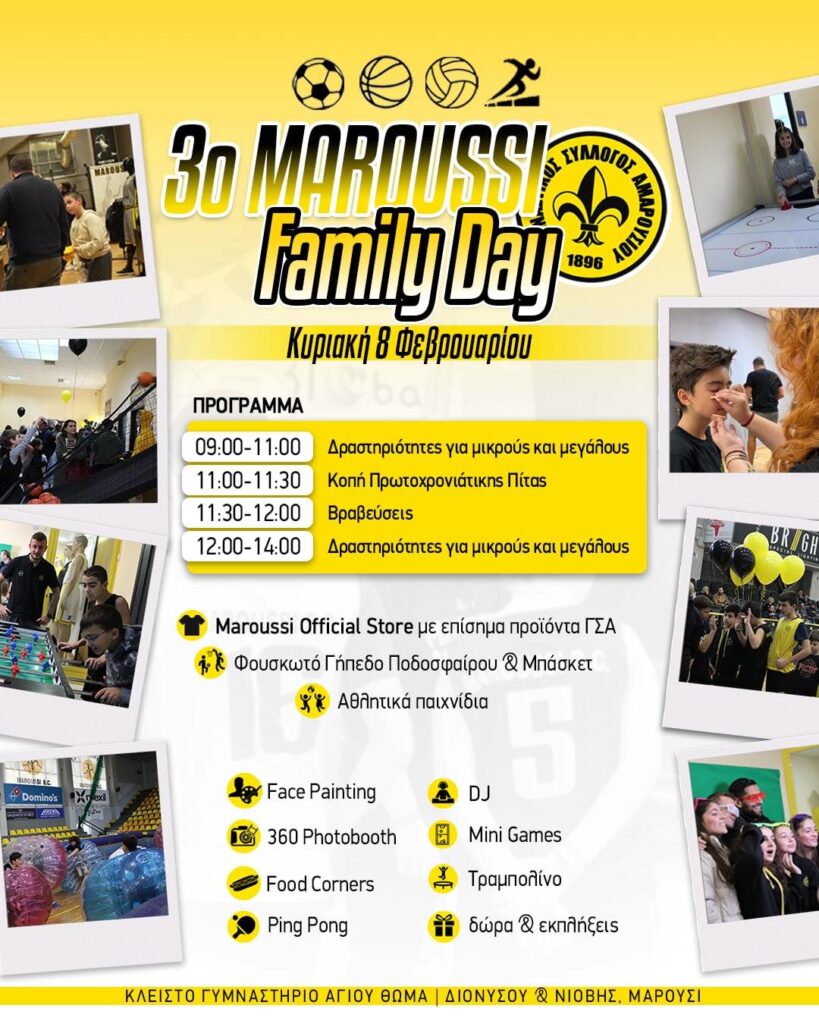 Την Κυριακή 8 Φεβρουαρίου, ο Γυμναστικός Σύλλογος Αμαρουσίου διοργανώνει το 3ο Maroussi Family Day, μια ανοιχτή γιορτή για μικρούς και μεγάλους, γεμάτη αθλητισμό, ψυχαγωγία και οικογενειακές δραστηριότητες.