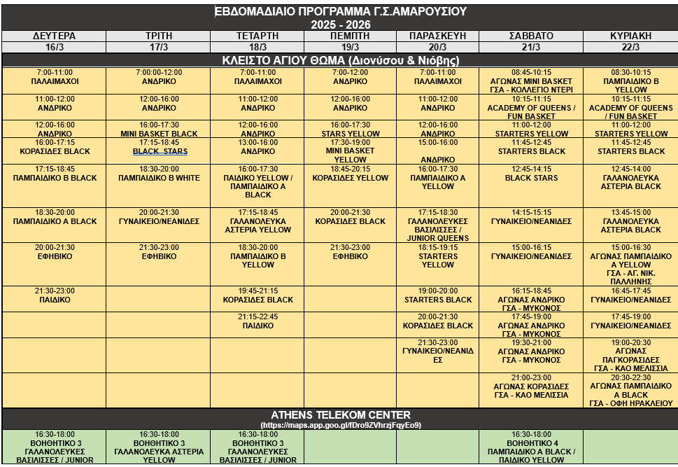 Εβδομαδιαίο Πρόγραμμα 16-22/03/2026 ΜΠΑΣΚΕΤΠΡΟΓΡΑΜΜΑ 16 Μαρτίου 2026 FacebookXPinterestWhatsApp Προηγούμενο άρθροΟ ΓΣ Αμαρουσίου στο πλευρό του Σικιαριδείου ΙδρύματοςΕπόμενο άρθροΟλοκληρώθηκε με επιτυχία η δράση στήριξης του Σικιαριδείου Ιδρύματος ΤΕΛΕΥΤΑΙΑ ΝΕΑ Συλλυπητήρια Ανακοίνωση για την απώλεια του Βασίλη Γκούμα Μαρούσι από… ατσάλι! Πήρε το ντέρμπι με 2-0 και φουλάρει για άνοδο! Εβδομαδιαίο Πρόγραμμα 30/03-05/04/2026 Πραγματοποιήθηκε η πρώτη ενημερωτική ομιλία για την εφηβεία και τη γυναικεία υγεία στον ΓΣ Αμαρουσίου Συλλυπητήρια ανακοίνωση για την απώλεια του Κωνσταντίνου Ιωαννίδη