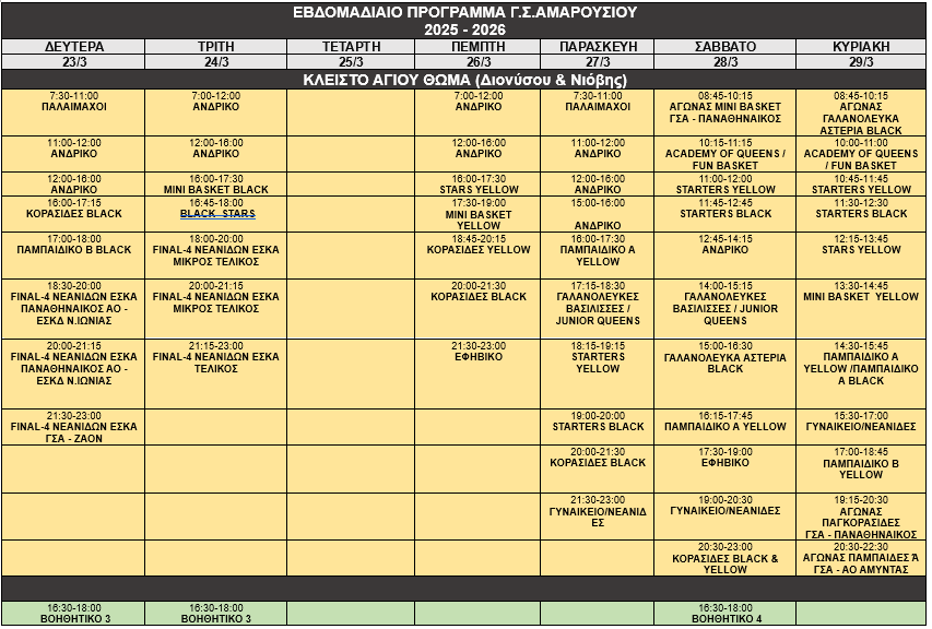 Εβδομαδιαίο Πρόγραμμα 23/03-29/03/2026 ΜΠΑΣΚΕΤΠΡΟΓΡΑΜΜΑ 23 Μαρτίου 2026 FacebookXPinterestWhatsApp Προηγούμενο άρθροΟλοκληρώθηκε με επιτυχία η δράση στήριξης του Σικιαριδείου ΙδρύματοςΕπόμενο άρθρο«Καταιγίδα» στο Ρουφ: Το Μαρούσι διέλυσε τα Πετράλωνα με 5άρα και έμεινε κορυφή! ΤΕΛΕΥΤΑΙΑ ΝΕΑ Συλλυπητήρια Ανακοίνωση για την απώλεια του Βασίλη Γκούμα Μαρούσι από… ατσάλι! Πήρε το ντέρμπι με 2-0 και φουλάρει για άνοδο! Εβδομαδιαίο Πρόγραμμα 30/03-05/04/2026 Πραγματοποιήθηκε η πρώτη ενημερωτική ομιλία για την εφηβεία και τη γυναικεία υγεία στον ΓΣ Αμαρουσίου Συλλυπητήρια ανακοίνωση για την απώλεια του Κωνσταντίνου Ιωαννίδη