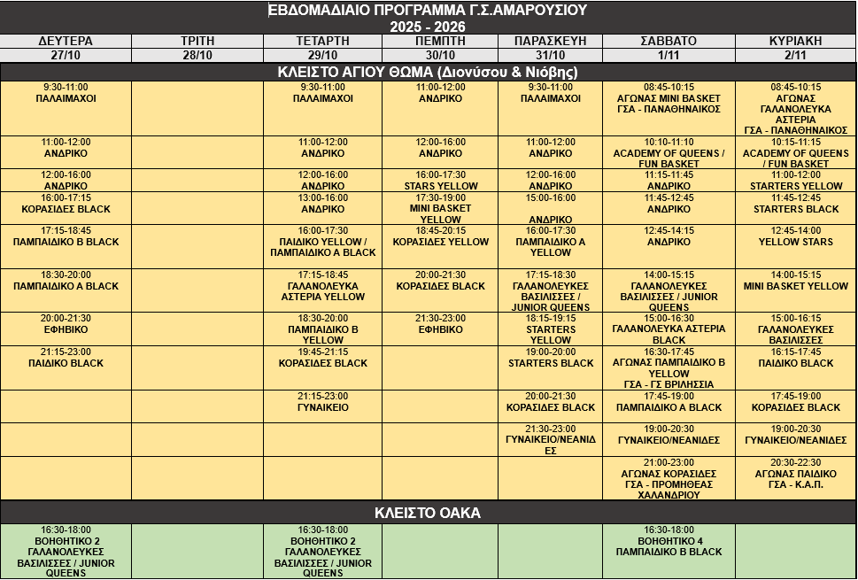Εβδομαδιαίο Πρόγραμμα 27/10-02/11/2025 ΜΠΑΣΚΕΤΠΡΟΓΡΑΜΜΑ 30 Οκτωβρίου 2025 FacebookTwitterPinterestWhatsApp Προηγούμενο άρθροΚατάθεση Στεφάνου από τον Ερασιτέχνη Γ.Σ. Αμαρουσίου για την 28η ΟκτωβρίουΕπόμενο άρθροΕβδομαδιαίο Πρόγραμμα 03-09/11/2025 ΤΕΛΕΥΤΑΙΑ ΝΕΑ Δυναμική παρουσία του Γ.Σ. Αμαρουσίου στα Λιοφίλεια 2025 – Πανελλήνιο και Βαλκανικό ρεκόρ από τη Στεφανιδάκη Πρεμιέρα Β’ Γύρου με εκτός έδρας νίκη για τις Κορασίδες του Γ.Σ. Αμαρουσίου Γ.Σ. Αμαρουσίου: Δρομολογείται ένα διαχρονικό αίτημα για το νέο γήπεδο ποδοσφαίρου Μαρούσι πρωταθλητισμού: 2-0 επί του Φωστήρα Καισαριανής Εβδομαδιαίο Πρόγραμμα 15-21/12/2025