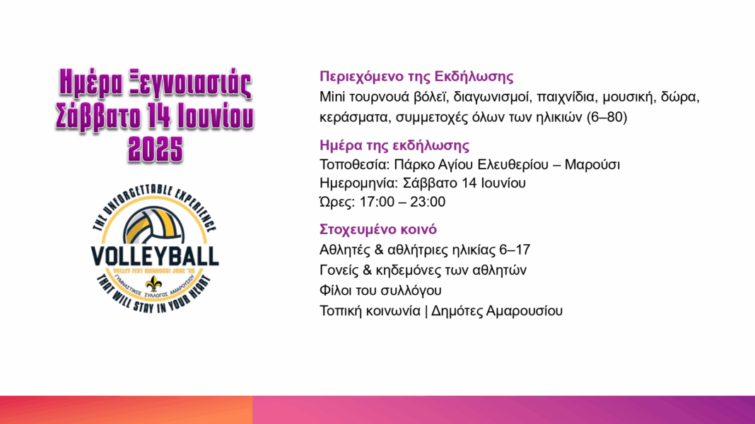 Ημέρα Ξεγνοιασιάς -ΓΣΑ Volley Fest |14/06/2025 ΒΟΛΕΪΝΕΑ - ΑΝΑΚΟΙΝΩΣΕΙΣ 28 Μαΐου 2025 FacebookTwitterPinterestWhatsApp Προηγούμενο άρθροΝέο ατομικό ρεκόρ για τον Διακοστεφανή στις Βρυξέλλες!Επόμενο άρθροΕβδομαδιαίο Πρόγραμμα 02-08/06/2025 ΤΕΛΕΥΤΑΙΑ ΝΕΑ Δυναμική παρουσία του Γ.Σ. Αμαρουσίου στα Λιοφίλεια 2025 – Πανελλήνιο και Βαλκανικό ρεκόρ από τη Στεφανιδάκη Πρεμιέρα Β’ Γύρου με εκτός έδρας νίκη για τις Κορασίδες του Γ.Σ. Αμαρουσίου Γ.Σ. Αμαρουσίου: Δρομολογείται ένα διαχρονικό αίτημα για το νέο γήπεδο ποδοσφαίρου Μαρούσι πρωταθλητισμού: 2-0 επί του Φωστήρα Καισαριανής Εβδομαδιαίο Πρόγραμμα 15-21/12/2025