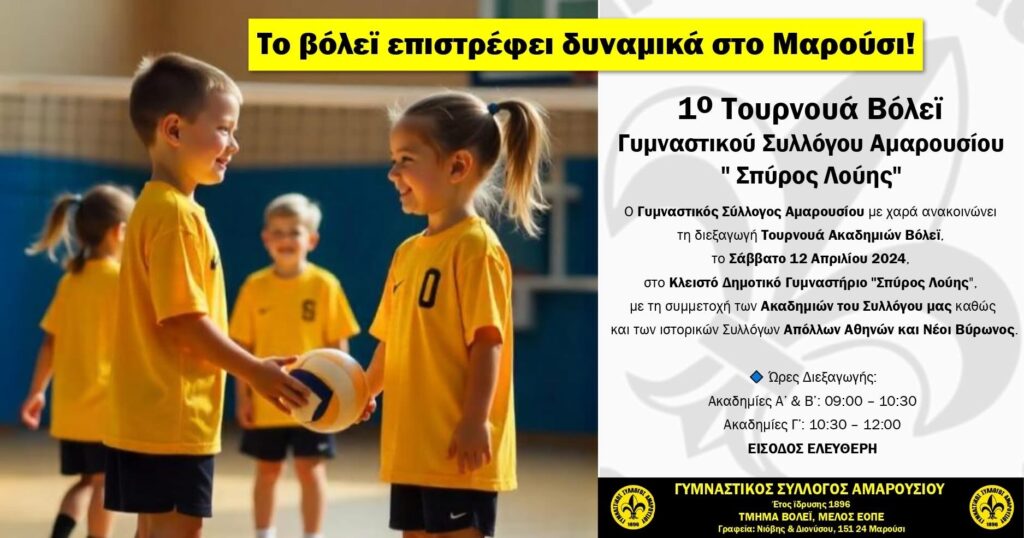 Ο Γυμναστικός Σύλλογος Αμαρουσίου με χαρά ανακοινώνει τη διεξαγωγή Τουρνουά Ακαδημιών Βόλεϊ, το Σάββατο 12 Απριλίου 2024, στο Κλειστό Δημοτικό Γυμναστήριο “Σπύρος Λούης”, με τη συμμετοχή των Ακαδημιών του Συλλόγου μας καθώς και των ιστορικών Συλλόγων Απόλλων Αθηνών και Νέοι Βύρωνος.