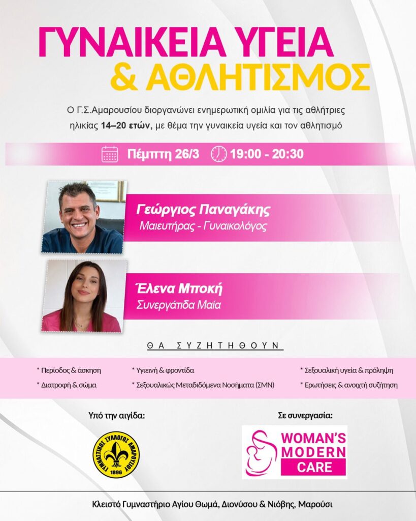Με επιτυχία πραγματοποιήθηκε η πρώτη σύντομη ενημερωτική ομιλία του που διοργάνωσε ο ΓΣ Αμαρουσίου σε συνεργασία με το Γυναικολογικό Ιατρείο Womans Modern Care με θέμα «Γυναικεία Υγεία & Αθλητισμός», ανοίγοντας έναν νέο κύκλο δράσεων για τις αθλήτριες του Συλλόγου.